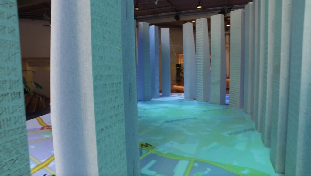 Door een hekwerk van vilten pilaren kunnen bezoekers als het ware Gaza binnenstappen en daar de beklemming voelen van het opgesloten zijn. Aan de binnenzijde van de pilaren is met eenvoudige streepjes het grote aantal slachtoffers te zien, een indringende ervaring. De zachte vloer en het geluiddempende vilt versterken de verstilling. Op het vloerkleed is de plattegrond van Den Haag op schaal te zien, de internationale stad van vrede en recht. Zo wordt zichtbaar hoe klein en kwetsbaar Gaza eigenlijk is.